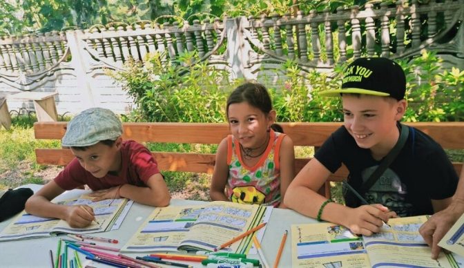 Arina (keskellä) ja hänen ystävänsä saivat omat kenkälaatikkolahjansa Moldovassa keväällä 2021.