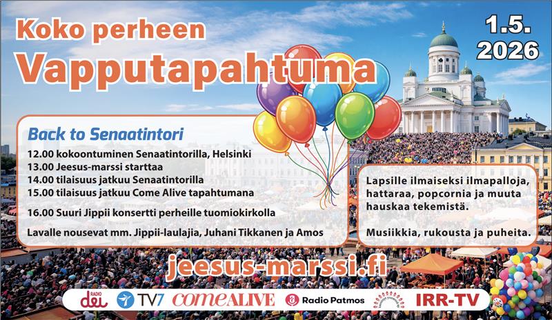 Jeesus-marssi järjestetään vappupäivänä useilla paikkakunnilla. Helsingissä kokoonnutaan Senaatintorille klo 12, marssi alkaa klo 13 ja iltapäivä jatkuu Come Alive -tapahtumalla. Mukaan voivat tulla kaikki – paikan päälle tai Radio Patmoksen välityksellä.